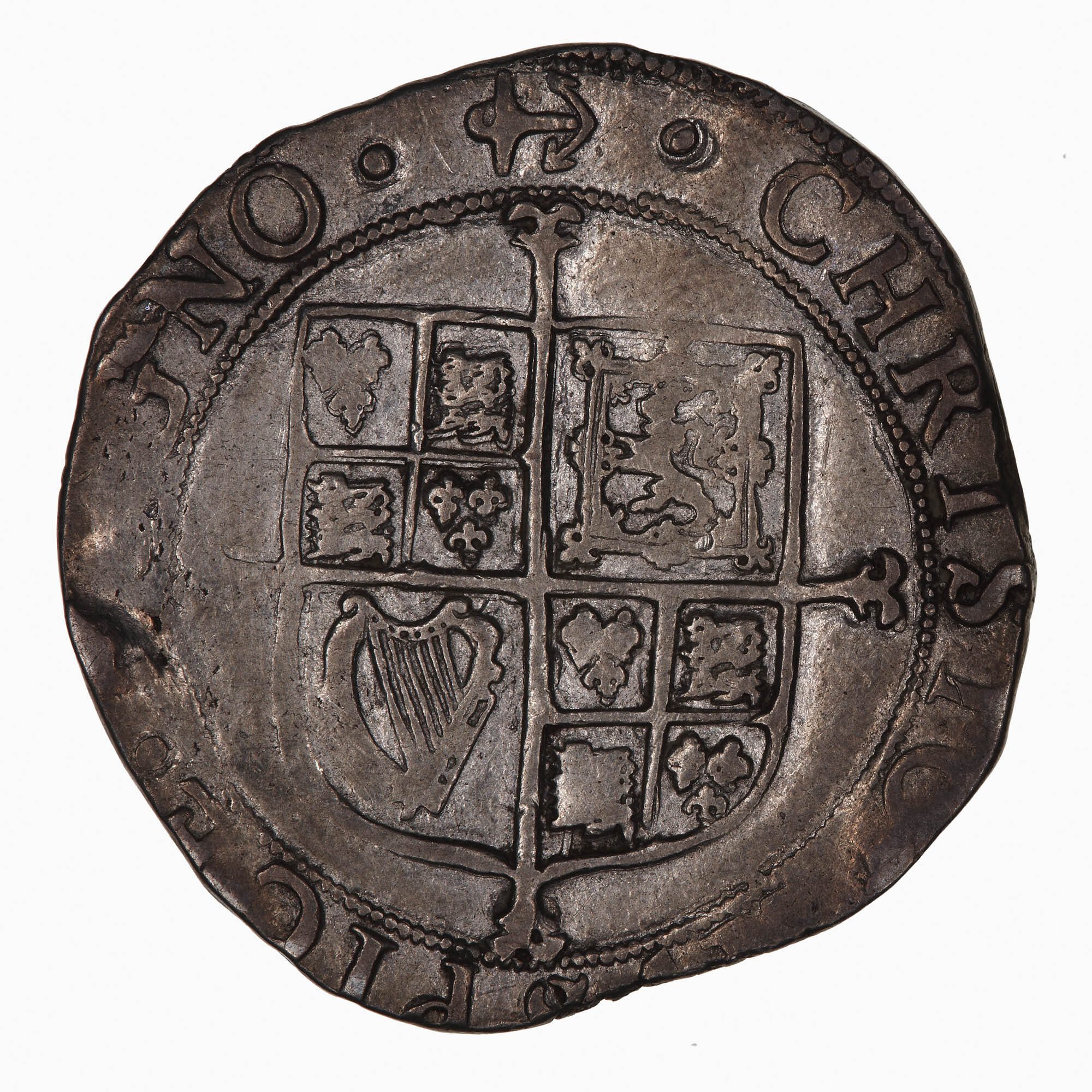 Flat topped shield quartered with combined arms of England and France (1st and 4th), Scotland and Ireland over a cross moline; around, CHRISTO AVSPICE REGNO (mm. anchor) (translation: I reign under the auspices of Christ)