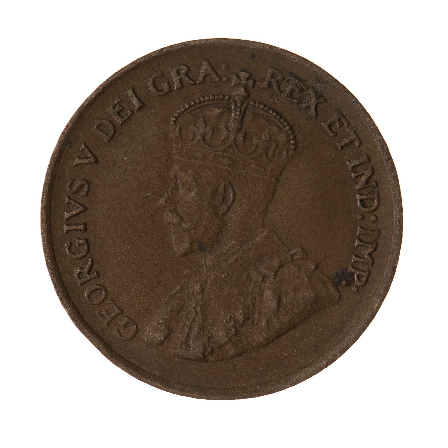 Crowned and draped bust of the King facing left; around, GEORGIVS V DEI GRA: REX ET IND: IMP:; artist's initials, B.M., on bust truncation