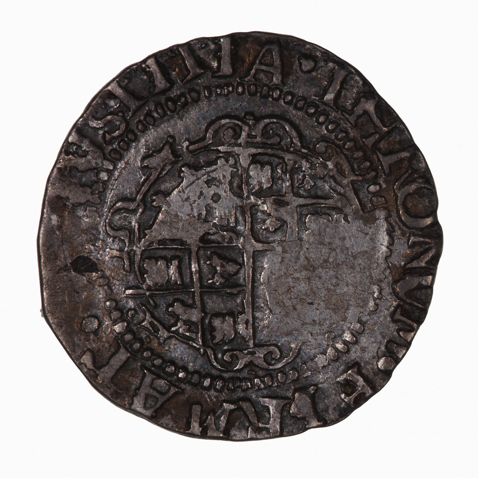 Within an inner circle of beads, a garnished oval shield quartered with combined arms of England and France (1st and 4th), Scotland and Ireland; around, IVSTITIA THRONVM FIRMAT (mm. star, worn) (translation: Justice strengthens the throne)