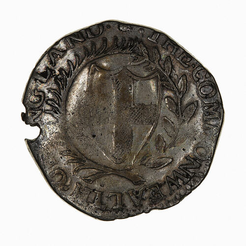 Within a wreath of palm and laurel a shield bearing the cross of St. George; around, (mm. sun) THE COMMONWEALTH OF ENGLAND (edge damage through E of ENGLAND)