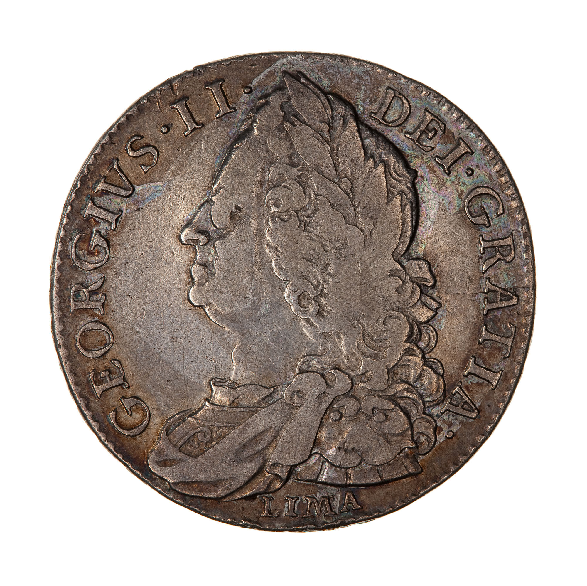 The word LIMA below the King's bust records that this coin was struck with bullion seized by Admiral Anson during his world voyage (1739-1743) or by other privateers in the Atlantic. The word LIMA was added to the coin at the request of the Bank of England to commemorate the exploits. Much of the Spanish coin captured bore the Lima mint mark.