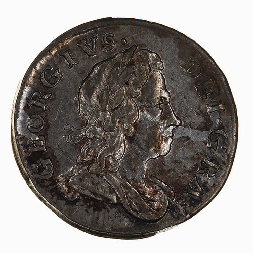 Laureate and draped bust of the King facing right; around, GEORGIVS DEI GRA