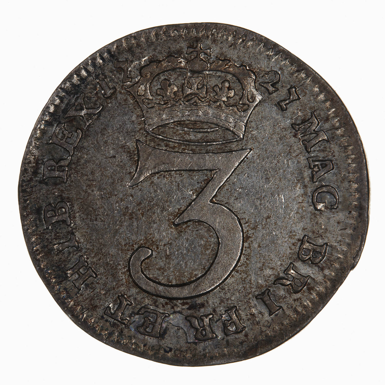 At centre, the numeral 3 crowned; around, MAG BRI FR ET HIB REX 1727; the date divided by the crown