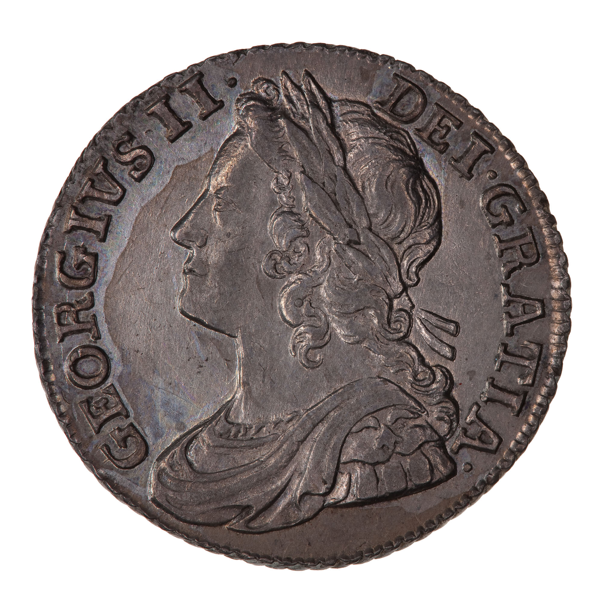 Young laureate bust of George II facing left wearing armour, with lion's head on shoulder; around, GEORGIVS II DEI GRATIA.