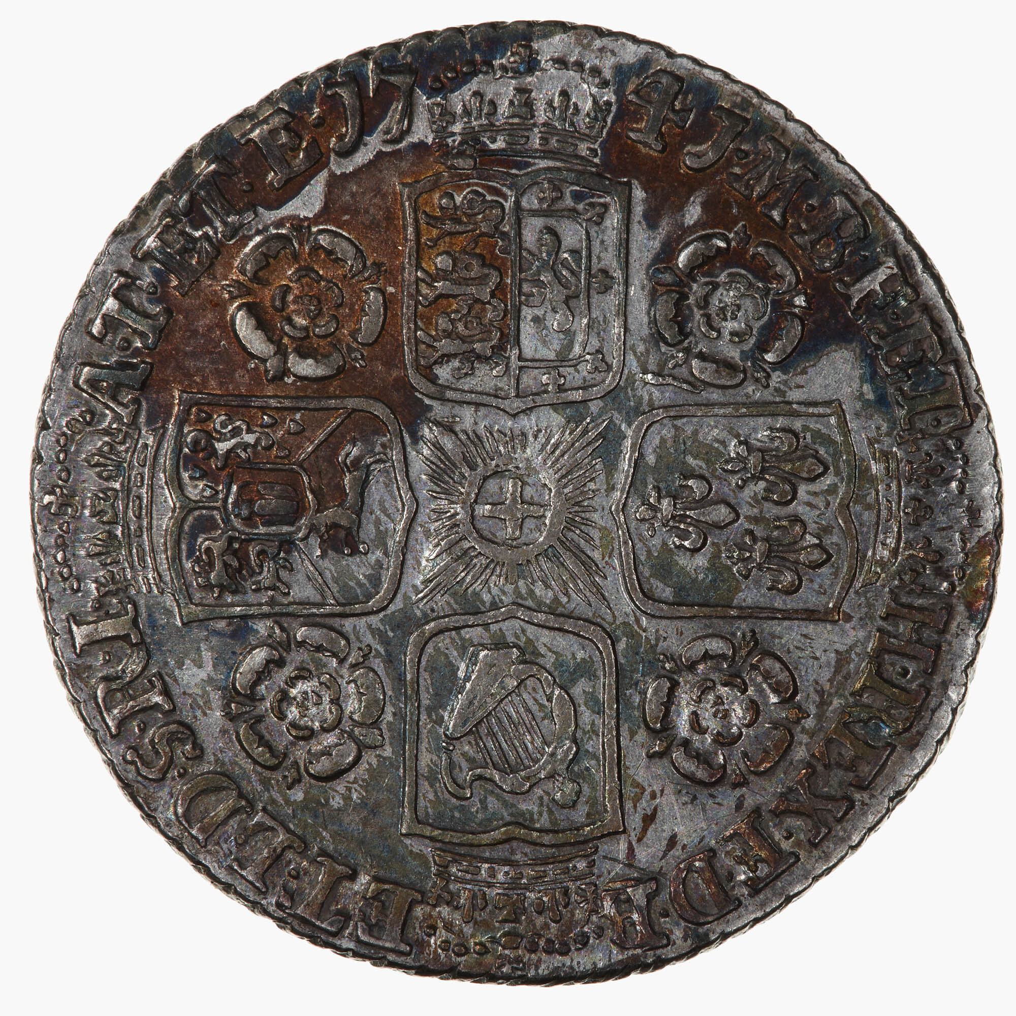Four crowned shields arranged to form a cross, England and Scotland impaled, France, Ireland and the Electorate of Brunswick and Luneburg; Star of the Garter at the centre; a rose in each angle; around, M B F ET H REX F D B ET L D S R I A T ET E 1741, the date being broken by a crown. (Translation obverse and reverse: George II by the Grace of God King of Great Britain, France and Ireland, Duke of Brunswick and Luneburg, Archi-Thesaurius and Elector of the Holy Roman Empire).