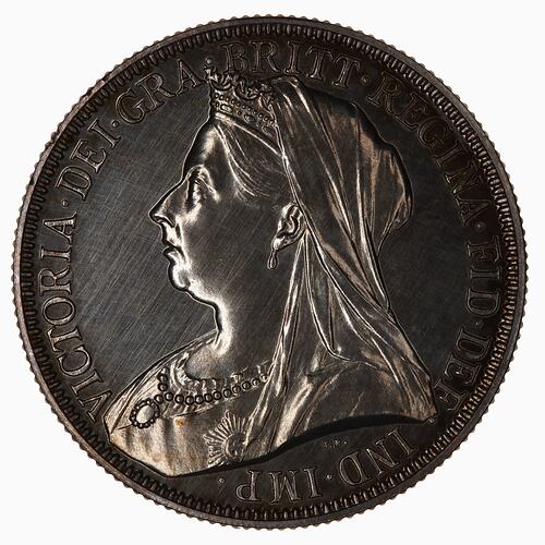 Crowned bust of the Queen facing left wearing veil over back of crown, ribbon and star of the Garter, pearl necklet with pendant and pearl earring; text around, 'VICTORIA. DEI. GRA. BRITT. REGINA. FID. DEF. IND. IMP.'; in field below bust the artist's initials, 'T.B.' (Thomas Brock).