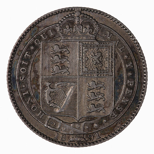 Within the Garter, crowned square shield quartered with the arms of England (1 & 4), Scotland (2) and Ireland (3); motto on Garter, HONI SOIT QUI MAL Y PENSE; below, divided by the base of the Garter, 1891
