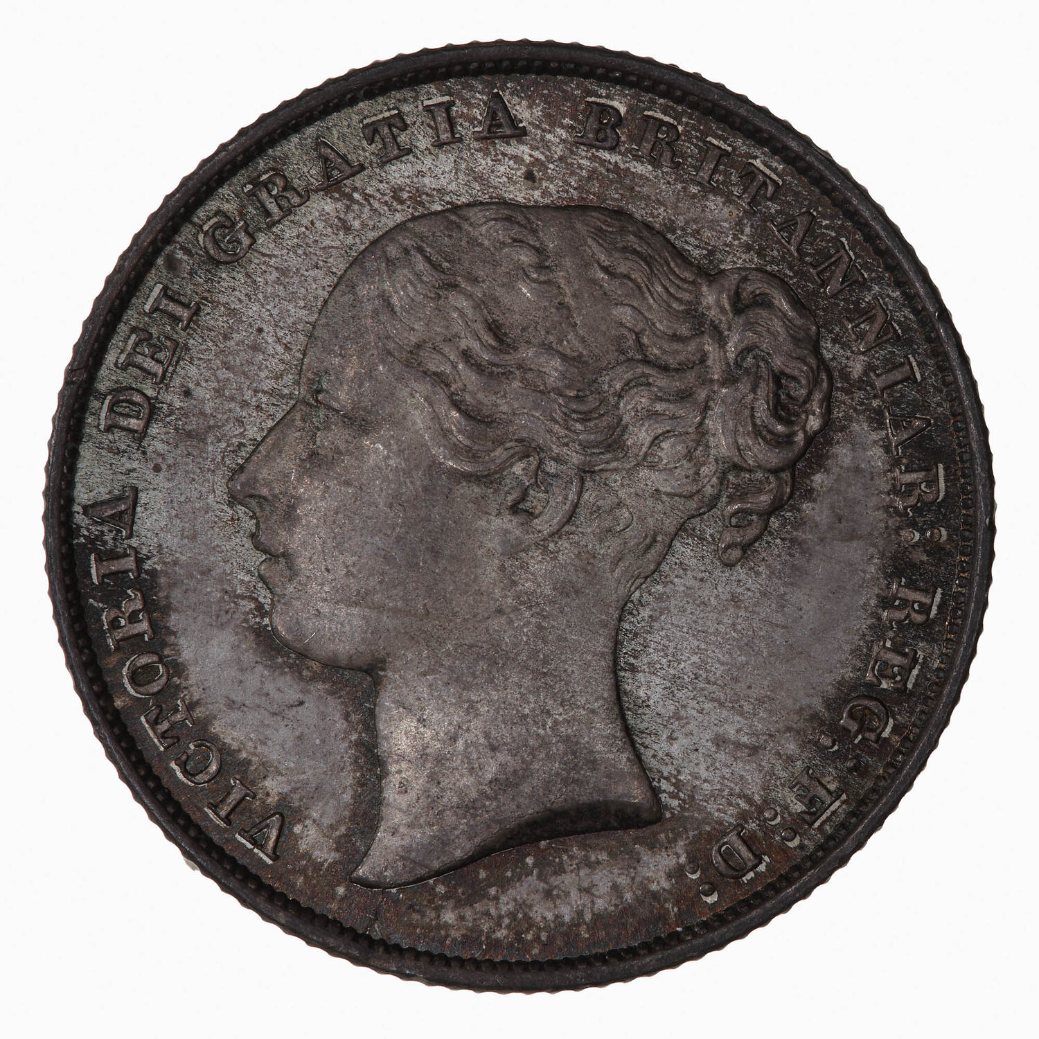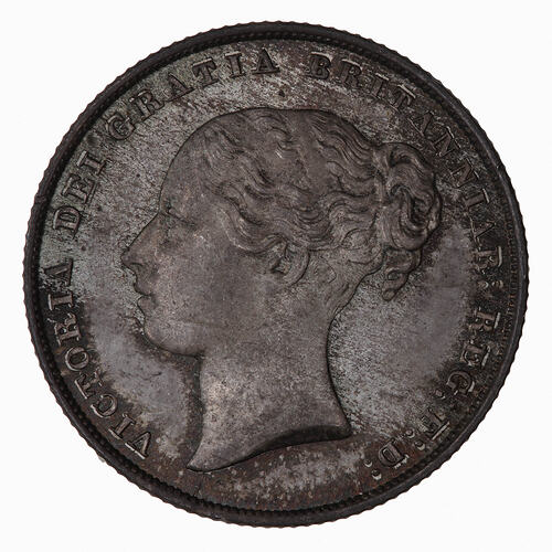 Head of the Queen facing left, ribbon in hair; around, VICTORIA DEI GRATIA BRITANNIAR: REG: F:D: