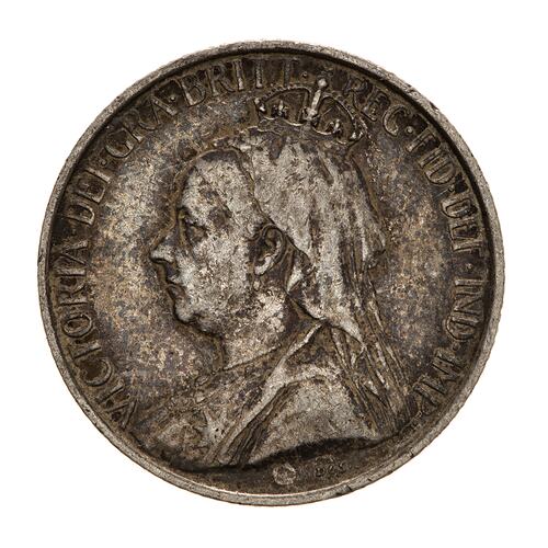 Crowned bust of Victoria left; around, VICTORIA DEI GRA BRITT REG FID DEF IND IMP