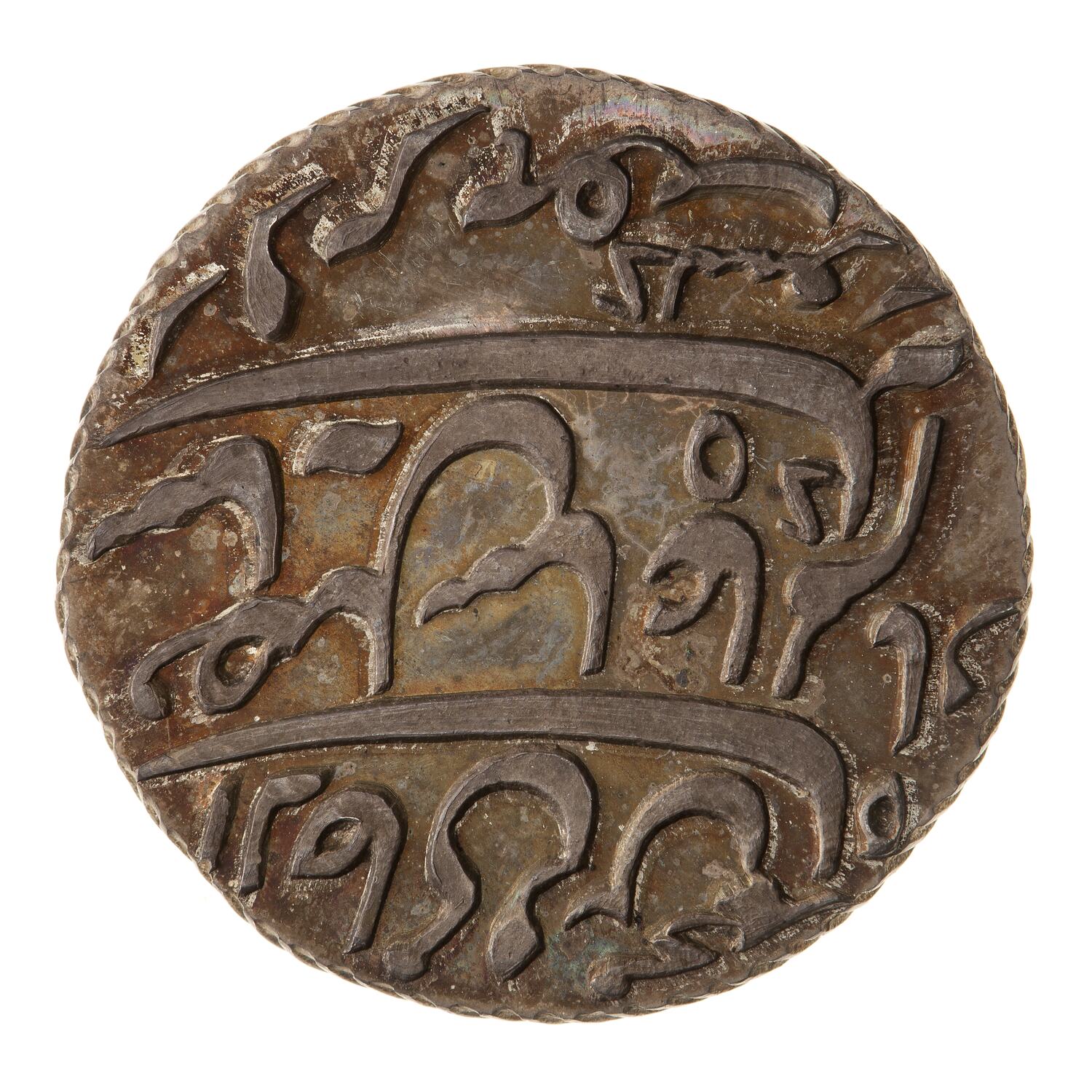 Persian Julus formular (Pridmore 13) (translation: Struck at the mint of Murshidabad in year 19 of his reign of tranquil prosperity) incomplete die, dots not added