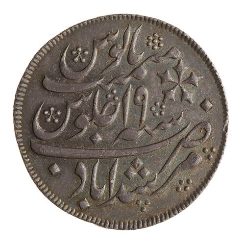 Persian couplet (translation: Defender of the religion of Muhammad. Shah Alam. Emperor. Shadow of the devine favour, put his stamp on the seven climes 1202)