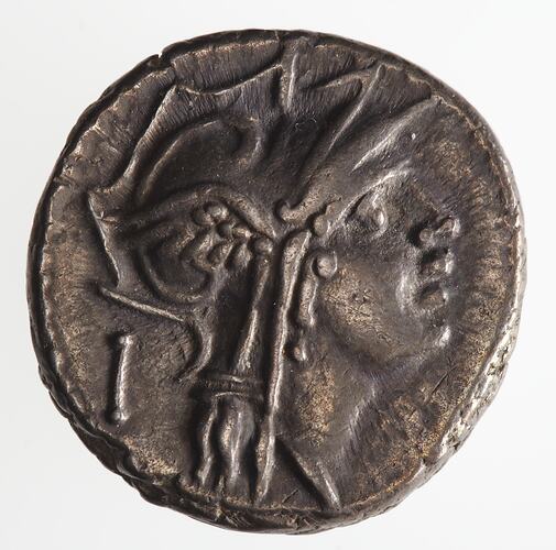 Head of Roma wearing a winged helmet facing right; behind, the control-mark I