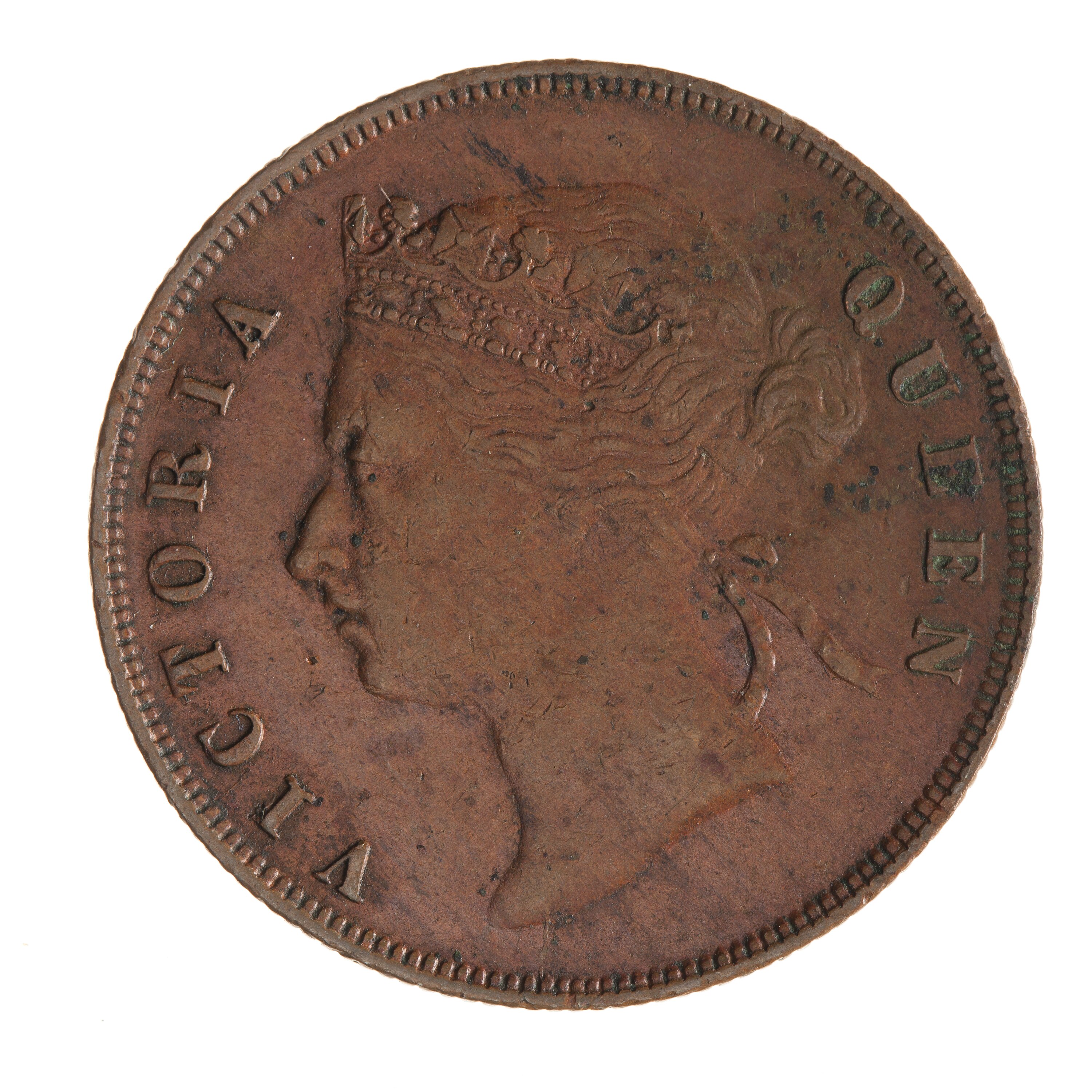 Head of the Queen, wearing coronet or diadem ornamented with jewels, facing left; around, VICTORIA QUEEN. The ends of the coronet are connected by a band decorated with a scroll which is partly hidden by the hair. The hair is drawn into a knot behind the head and teied with a bow at the back of the head.