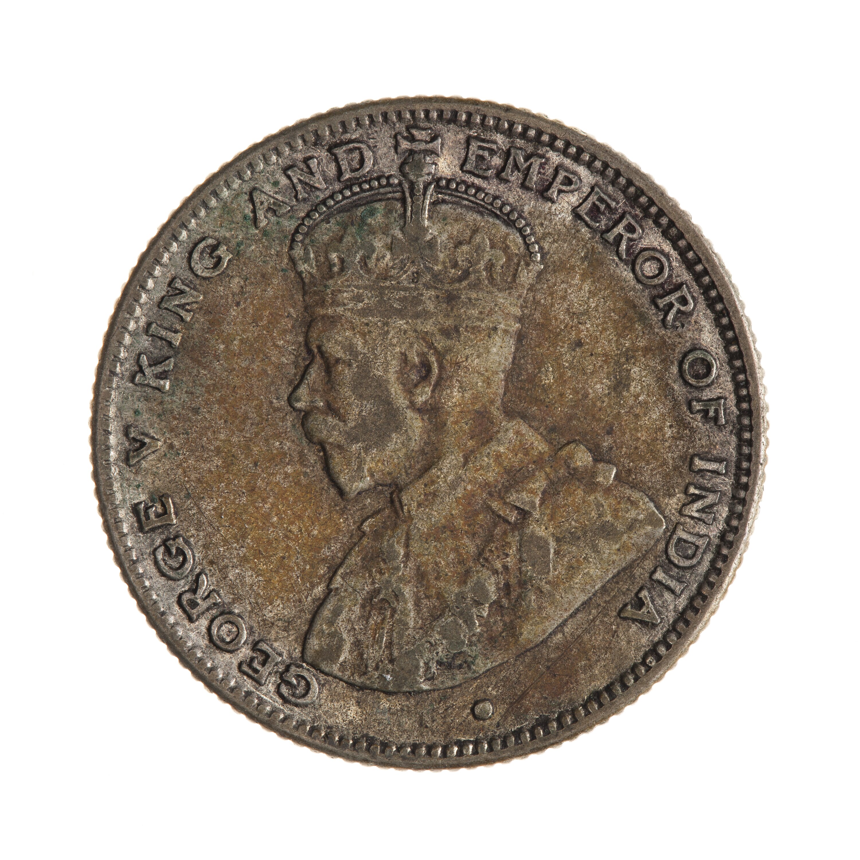 Bust of the King wearing the Imperial crown and an ermine robe with the collar of the Garter and the badge of the Bath; around, GEORGE V KING AND EMPEROR OF INDIA; the artist's initials, BM, on bust truncation; mint mark, B, on band of crown
