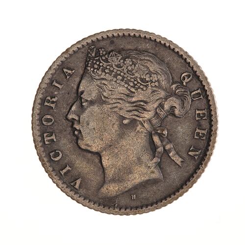 Head of the Queen wearing coronet facing left; around, VICTORIA QUEEN; mint mark, H, below neck
