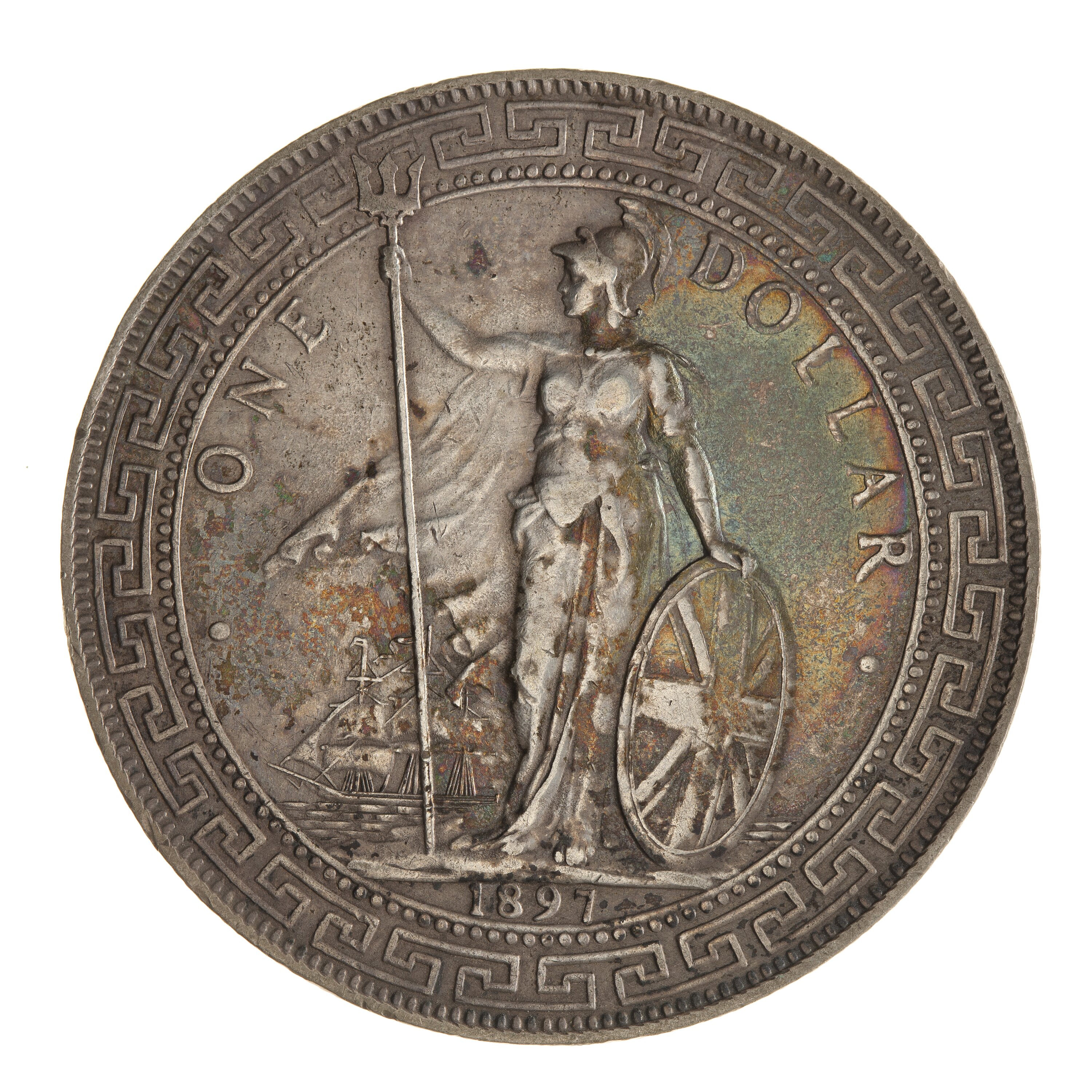 Britannia standing helmeted looking to left; her right hand grasps a trident (from which mint mark B worn off) and her left rests on a shield; a sailing ship on the horizon at left; in exergue, 1897; around ONE DOLLAR