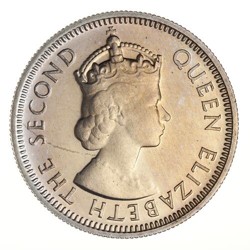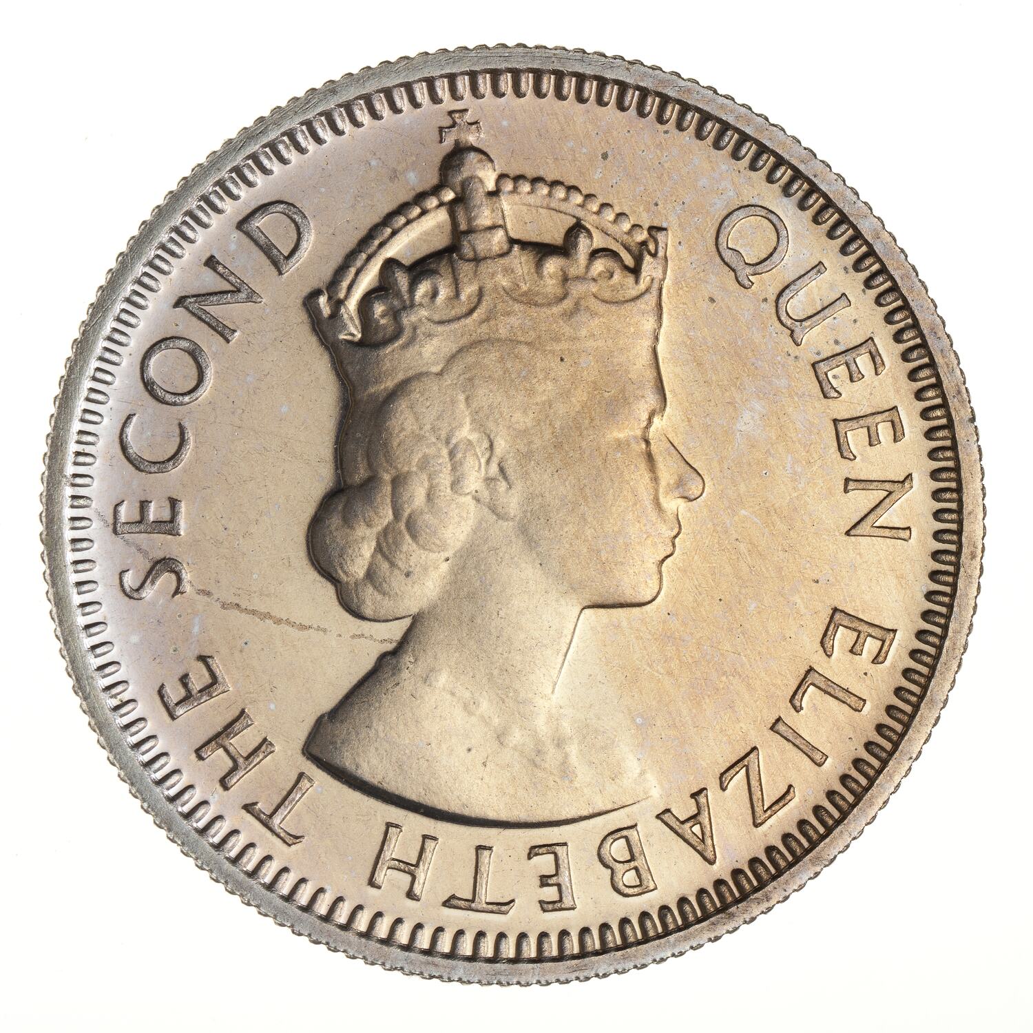 This is a Proof of Record example of the first issue in the name of Elizabeth II for Malaya and British North Borneo, in 1953 the 5 and 10 cents denominations were issued and in 1954 the 20 and new 50 cents pieces. This coin was supplied to the Melbourne Branch of the Royal Mint from London and then to the National Gallery of Victoria.