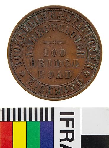 A round copper token (34 mm diameter) with the name, address and business of the issuer: Barroclough, 100 Bridge Road, Richmond, Bookseller and Stationer. The reverse is a Stokes stock Arms : Coat of arms consisting of a central shield set on grass covered ground and below Rising Sun. On left a kangaroo seated facing out but head back towards sun (sejant sinister reguardant) and on right emu with similar stance (passant dexter reguardant). Below ground line and set on bouquet of rose, thistles and shamrock, a ribbon with the motto ADVANCE AUSTRALIA. The shield is quartered by a cross with a star at the centre and at the end of each arm. The cross is shaded with horizontal and vertical lines, hatched around the stars. The quarters contain: top left, a three-masted sailing ship; top right, a golden fleece; bottom left, an anchor; and bottom right, a wheat sheaf. Around above, VICTORIA . 1862 around below in two lines, T. STOKES MAKER / 100 COLLINS ST. EAST MELBOURNE.