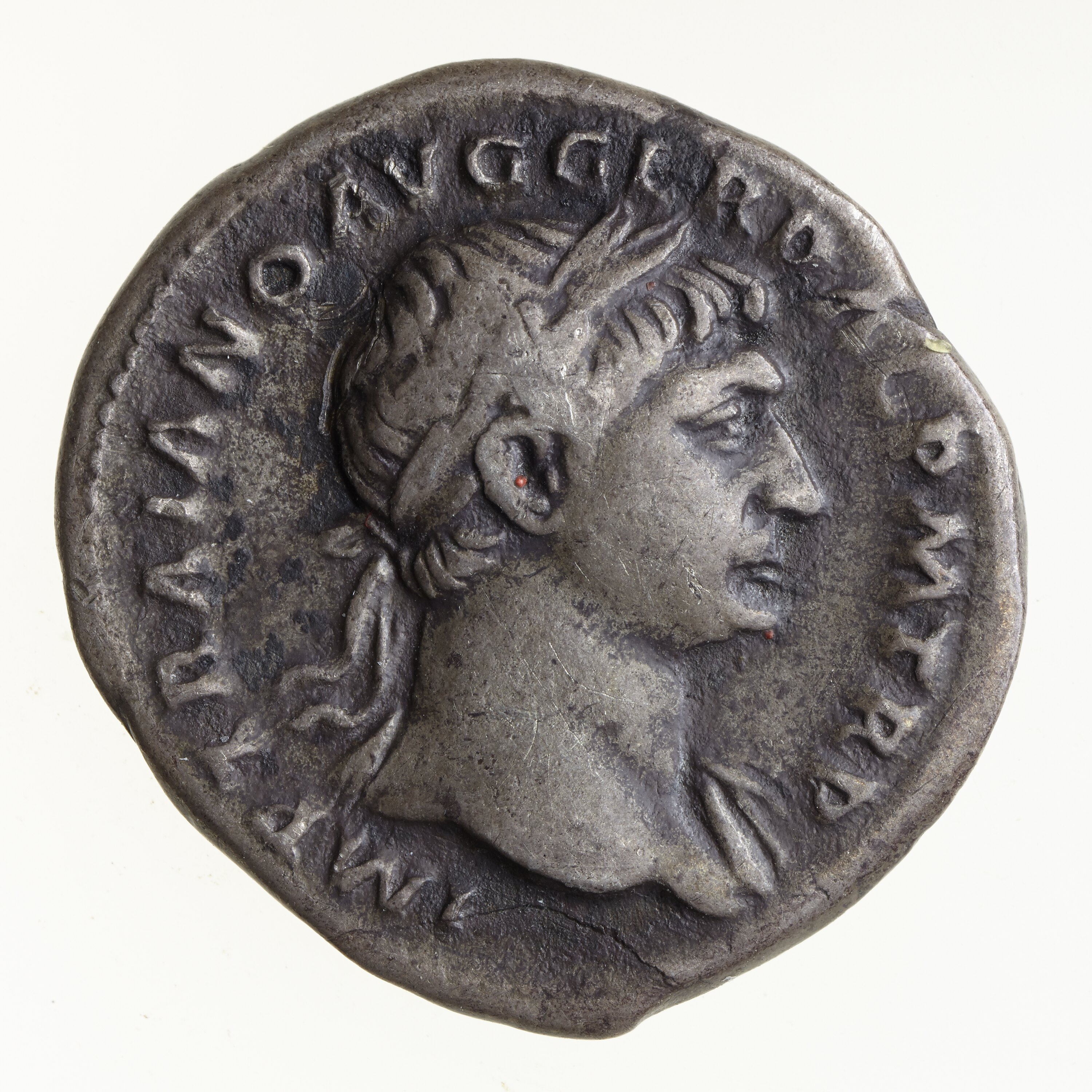 Laureate head of Trajan facing right, drapery on left shoulder; around, IMP TRAIANO AVG GER DAC PM TR P