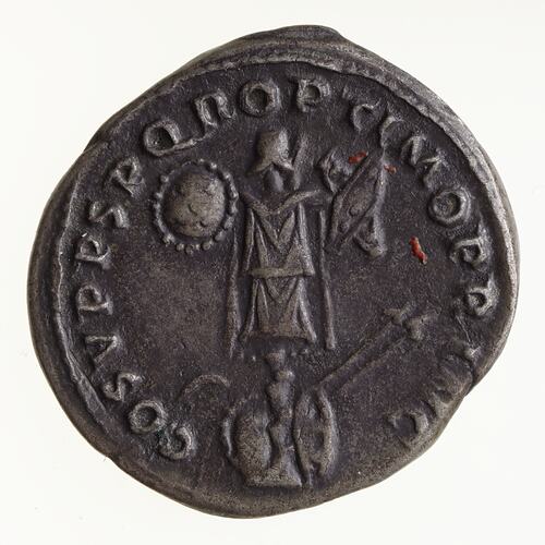 Trophy with a round shields at left and two hexagonal shields at right, at base of trophy a sword, two javelins and two shields; around, COS V P P S P Q R OPTIMO PRINC