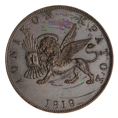 Winged lion of St. Mark facing to left holding Bible and seven arrows; below, 1819; around above in Greek, IONIKON KPATOS
