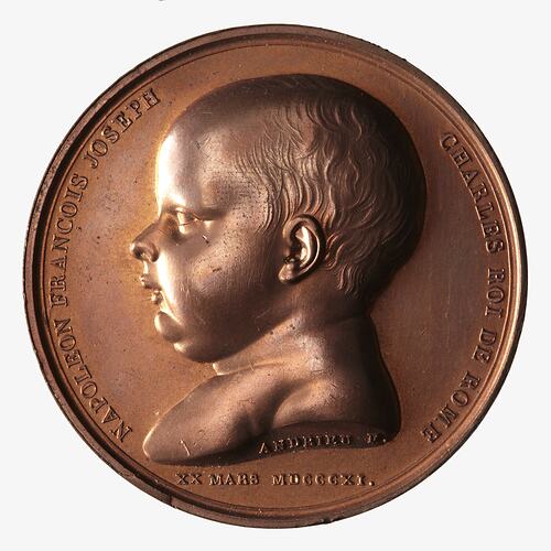 Bust of infant facing left; on bust truncation, ANDRIEU F.; around, NAPOLEON FRANCOIS JOSEPH CHARLES, ROI DE ROME. below, XX MARS MDCCCXI.