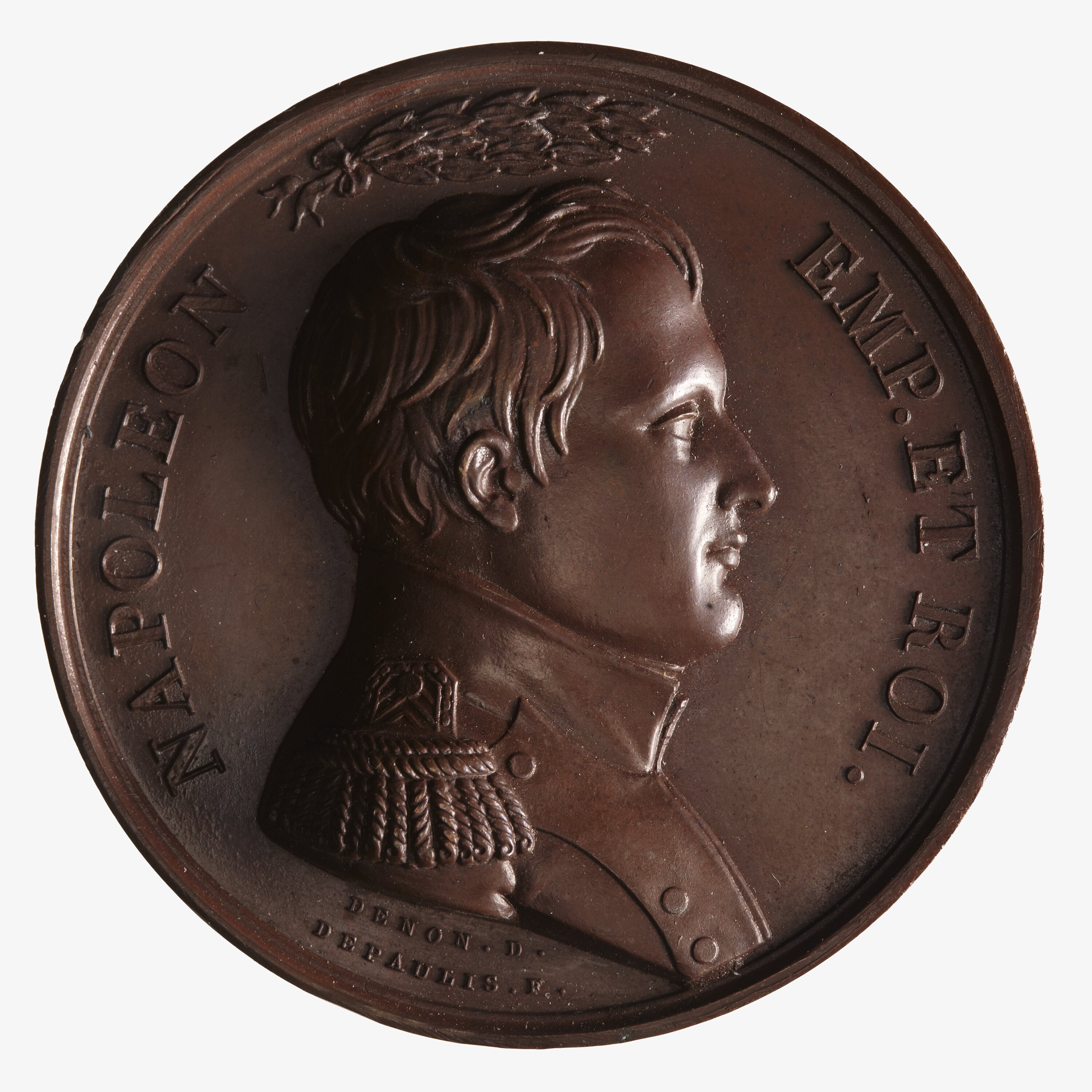 Bust in military uniform, head bare, facing right; above, a laurel wreath; around, NAPOLEON EMP. ET ROI.; below in small lettering, DENON D. / DEPAULIS F.
