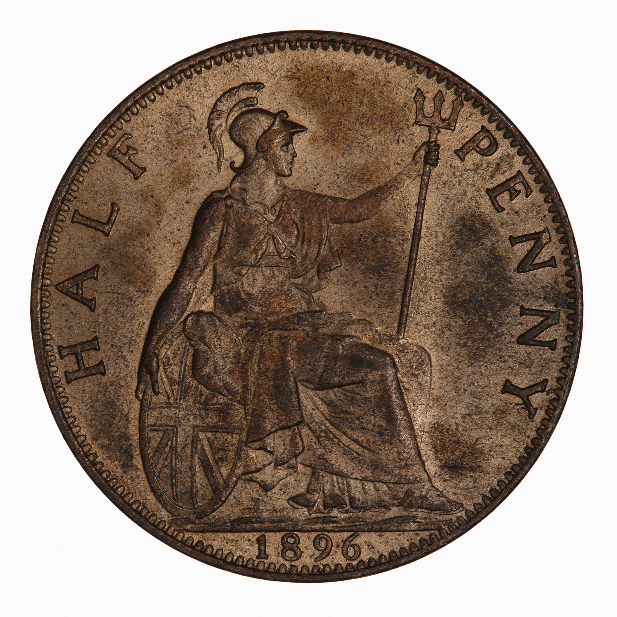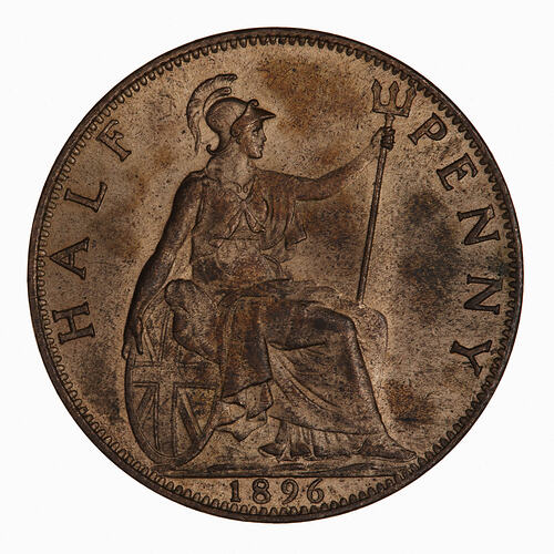 Britannia seated facing right on a rock wearing a helmet and flowing robes; she holds a trident and rests her right hand on a shield which bears the combined crosses of the Union Flag; around, HALF PENNY; in exergue, 1896