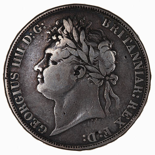 Laureate head of the King facing left; below in small letters the artist's initials, B.P. (Benedetto Pistrucci); around, GEORGIUS IIII D:G: BRITANNIAR: REX F:D: