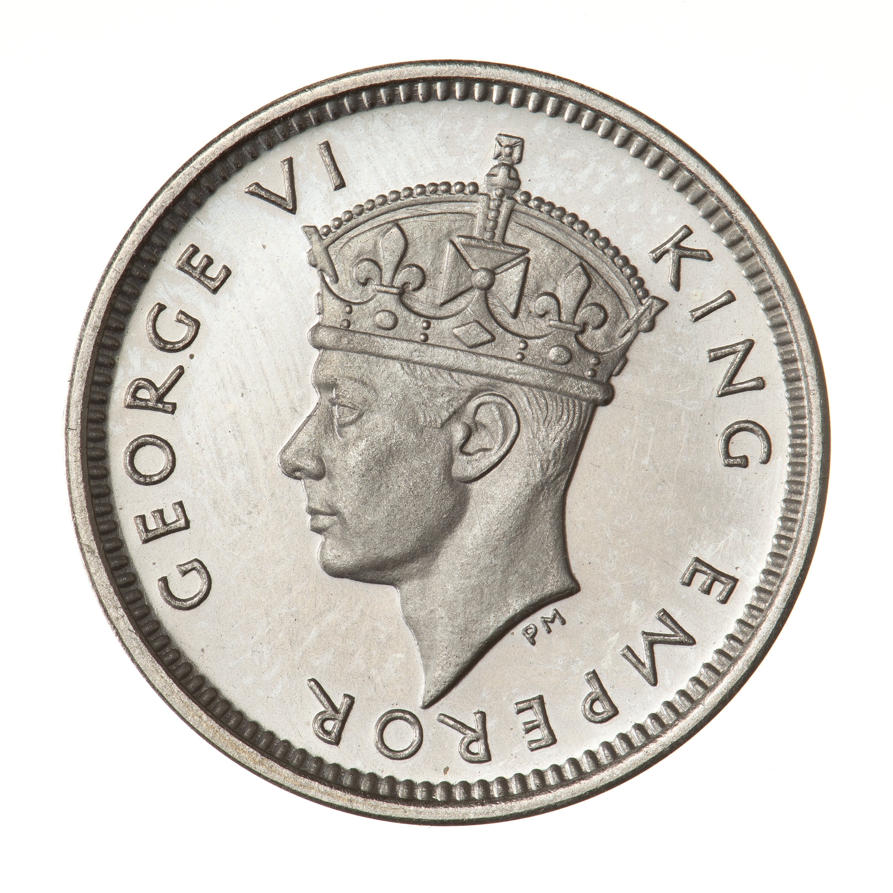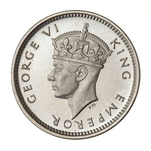 Crowned bust of the King facing left; around, GEORGE VI KING EMPEROR; artist's initials, PM, below neck truncation