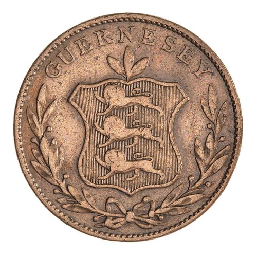 Shield of arms of Guernsey, three lions to left; around above, GUERNESEY; below, open laurel wreath