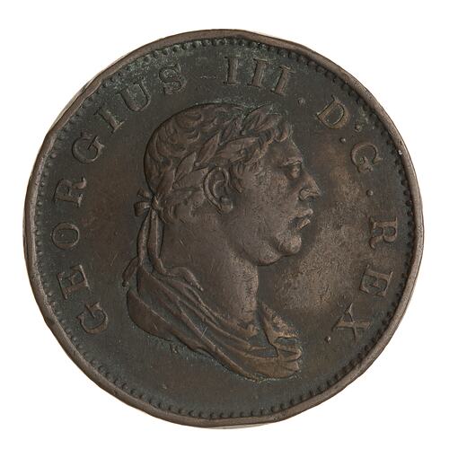 Laureate and draped bust of the King facing right; around, GEORGIVS III D: G: REX.