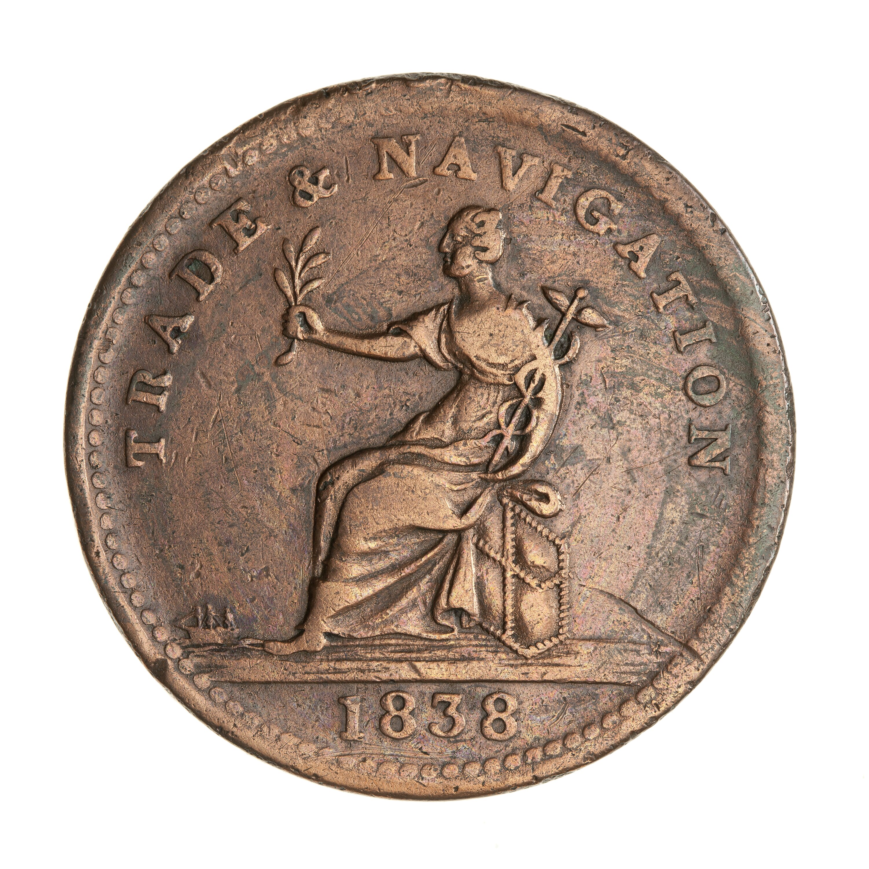 Female seated on a bale facing left holding caduceus and extending a palm branch in her right hand, 3 masted sailing ship on horizon at left; around above, TRADE & NAVIGATION; in exergue, 1838