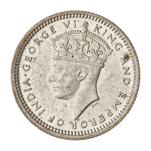 Crowned head of the King facing left; around, GEORGE VI KING AND EMPEROR OF INDIA; artist's initials, PM, below neck