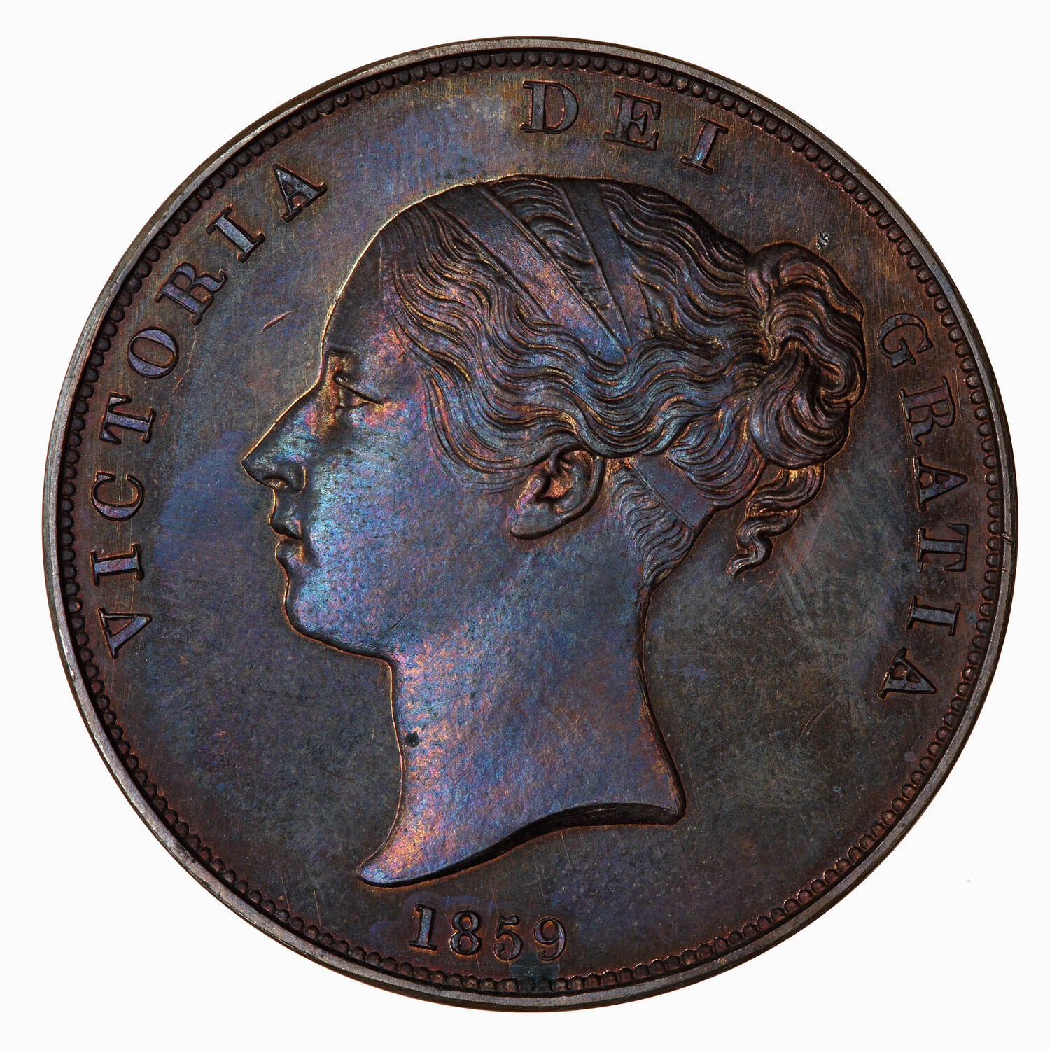 Head of Queen Victoria facing left, ribbon in her hair; around, VICTORIA DEI GRATIA; below, 1859