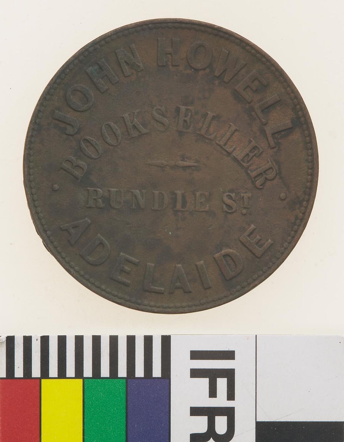 Copper One Penny Token, minted by an unknown British mint. Issued by John Howell, Liverpool Cheap Book Depot, Adelaide, circa 1858. Surcharged in three lined C. JENKINS / AUCTIONEER / ADELAIDE. The earliest mention of a bookseller by the name of John Howell was in 1855 when he had a premises in Hindley Street and in Strangways Terrace, North Adelaide. Howell seems to have built a substantial business quite rapidly. During 1858 he took out extensive advertisements in the Books and Stationery advertisements section of the Adelaide Advertiser. By 1864 he had moved to 4 Rundle Street and in addition to his books, music and stationery, his advertisement prominently announced that his business was a 'Depository of the Society for the promotion of Christian Knowledge.'
