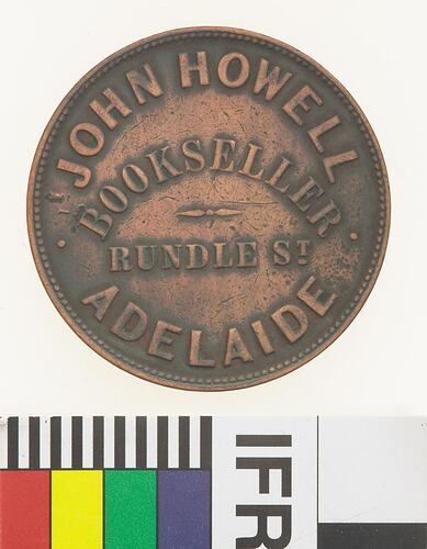 Copper One Penny Token, minted by an unknown British mint. Issued by John Howell, Liverpool Cheap Book Depot, Adelaide, circa 1858. Surcharged in three lined C. JENKINS / AUCTIONEER / ADELAIDE. The earliest mention of a bookseller by the name of John Howell was in 1855 when he had a premises in Hindley Street and in Strangways Terrace, North Adelaide. Howell seems to have built a substantial business quite rapidly. During 1858 he took out extensive advertisements in the Books and Stationery advertisements section of the Adelaide Advertiser. By 1864 he had moved to 4 Rundle Street and in addition to his books, music and stationery, his advertisement prominently announced that his business was a 'Depository of the Society for the promotion of Christian Knowledge.'
