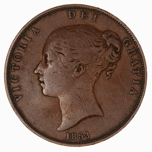 Pence of this design were in use in Victoria during the Gold Rush period. They were replaced by smaller bronze pence in 1860. Victorian Trade Tokens were based on the penny of this size.