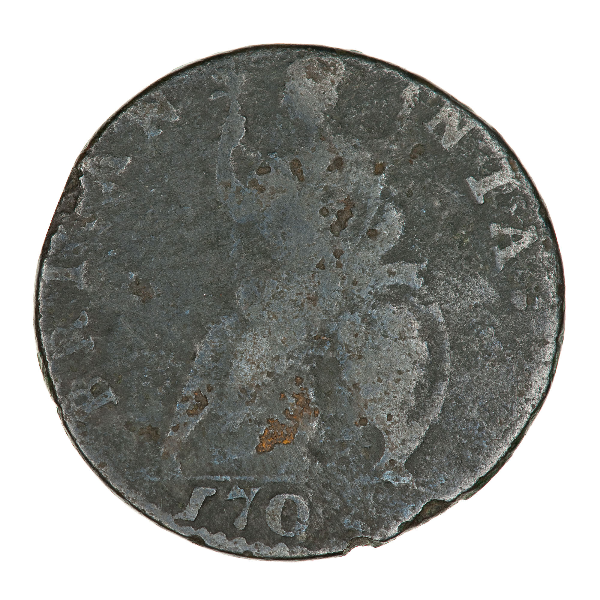 Britannia seated left holding an olive branch and spear her left arm resting on a shield; around, BRITANNIA; in exergue, 1700