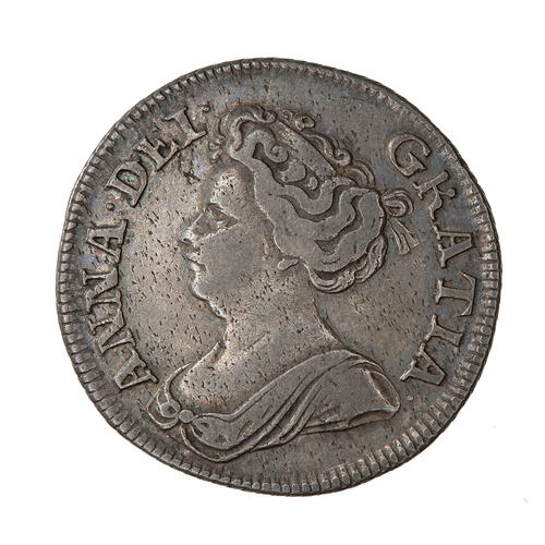 The legend reads as a single title from obverse to reverse and translates "Anne by the Grace of God Queen of Great Britain, France and Ireland". A shilling is a 12 pence coin.