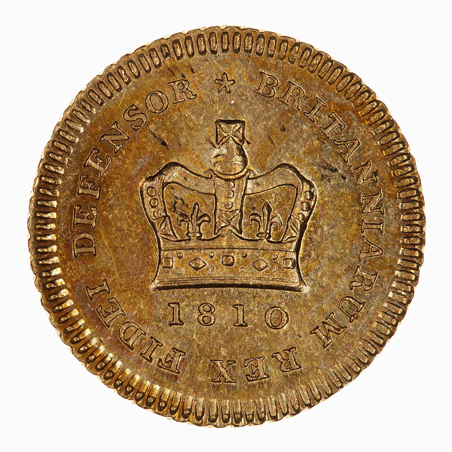 At centre a crown above the date 1810; around, * BRITANNIARUM REX FIDEI DEFENSOR