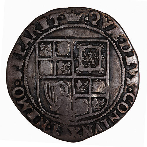 Within a beaded circle a square topped shield quartered with the combined arms of England and France (1 & 4), Scotland (2) and Ireland (3); around, (mm. coronet) QVAE DEVS CONIVNXIT NEMO SEPARET (translation, What God has joined let no man put asunder).
