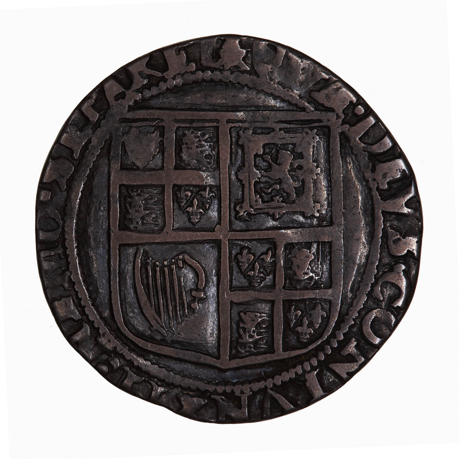 Within a beaded circle a square topped shield quartered with the combined arms of England and France (1 & 4), Scotland (2) and Ireland (3); around, (mm. mullet) QVAE DEVS CONIVNXIT NEMO SEPARET (translation, What God has joined let no man put asunder).