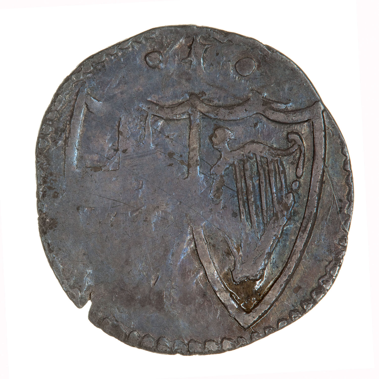 Within a beaded circle two conjoined shields, the one on the left bearing the cross of St. George and on the right, the Irish Harp; above, the denomination in pence, I