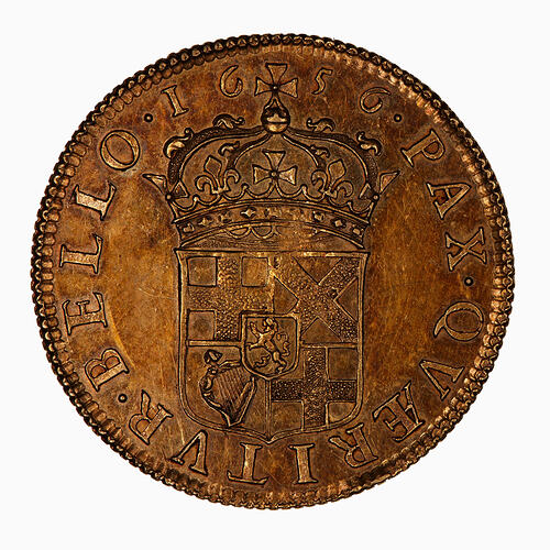 Crowned shield quartered with the cross of St George (1 and 4), cross of St. Andrew and Irish harp; with the Protector's family arms, a lion rampant, at the centre; around, PAX QVAERITVR BELLO 1656, the date being divided by the cross on the top of the crown. (translation: peace is sought by war)