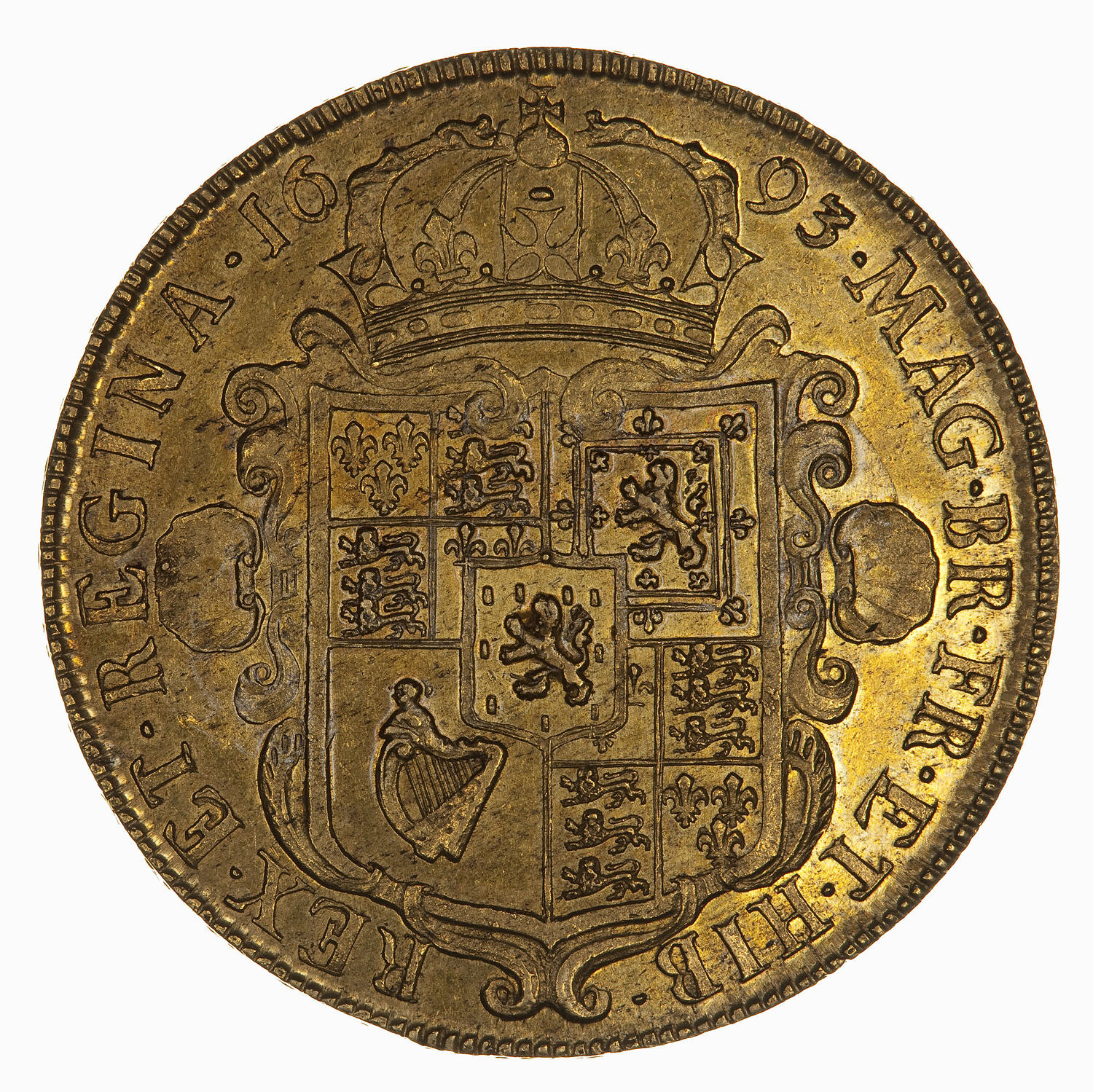 Crowned and garnished shield bearing the arms of England and France (quartered), Scotland, Ireland and of the House of Nassau at the centre; around, MAG. BR. FR. ET. HIB. REX. ET. REGINA 1693, the date being divided by the crown