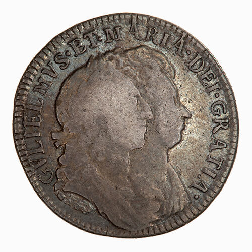 Laureate conjoined busts of William and Mary facing right; around, GVLIELMVS ET MARIA DEI GRATIA.