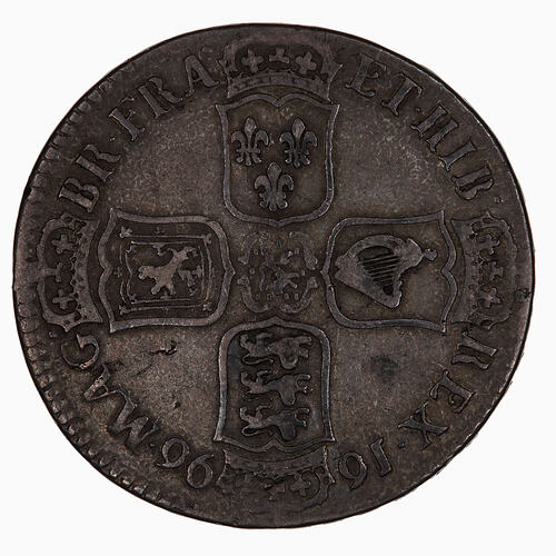 Crowned shields of England, Scotland, France and Ireland forming a cross shape around the arms of Nassau at the centre; around, MAG BR FR ET HIB REX ET 1696, the date being divided by the crown over the shield of England.