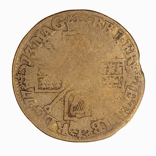 In 1707 the Act of the Union was passed joining England and Scotland into a single realm, this coin was struck after that so the shields of England and Scotland halved and repeated twice. Before the Union each set of arms occupied its own shield.