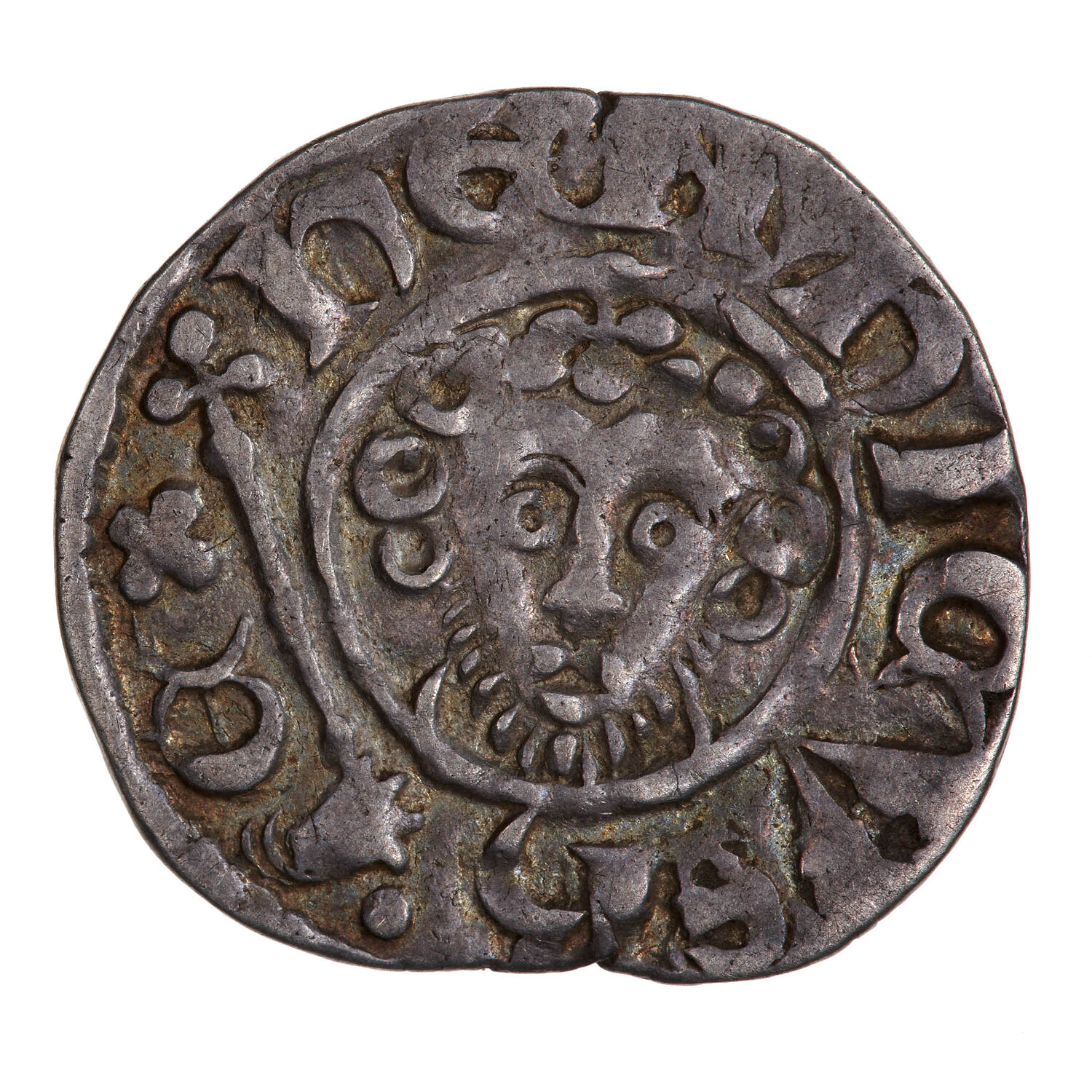 A short cross voided within a beaded circle, a quatrefoil in each angle; around, + ILGER ON LVNDE